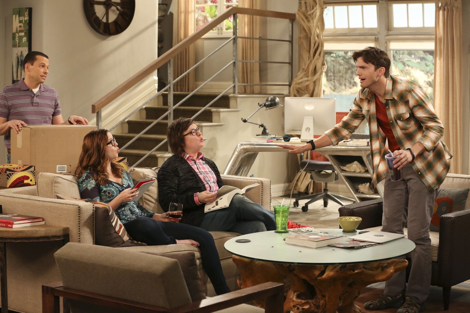 West Side StoryWalden (Ashton Kutcher, r.) flippt völlig aus, als er erfährt, dass seine große Liebe Kate in der Stadt ist und ihn sehen will. Alan (Jon Cryer, l.), Jenny (Amber Tamblyn, 2.v.l.) und Barry (Clark Duke, 2.v.r.) reagieren zurückhaltend ...Bild: © Warner Brothers Entertainment Inc. Lizenzbild frei