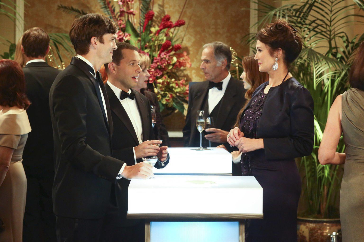 Wonder WomanAls Alan (Jon Cryer, 2.v.l.) auf einer Wohltätigkeitsveranstaltung Lynda Carter (Lynda Carter, r.), den Schwarm seiner Jugend erblickt, ist er Feuer und Flamme. Er bittet Walden (Ashton Kutcher, l.) um Hilfe, damit er ein Date kommt ...Bild: © Warner Bros. Television