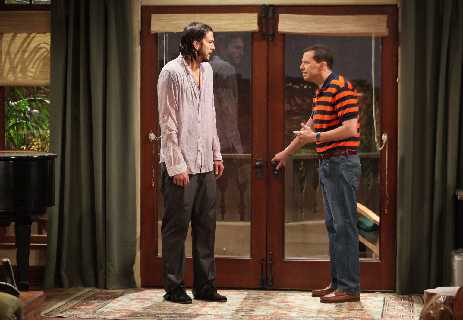 Die Paparazzi-FalleWalden (Ashton Kutcher, r.) kann nicht verstehen, dass Kandi und Alan (Jon Cryer, l.) verheiratet waren ...Bild: © Warner Bros. Television