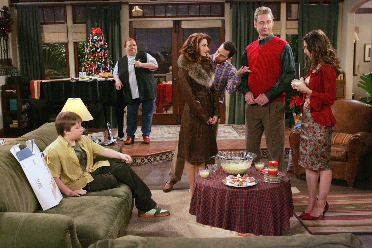 Alan ist andersDamit hat Charlie nicht gerechnet - er wollte eigentlich seinen Weihnachtsabend mit seiner Freundin im Bett verbringen und jetzt ist das Haus voll mit ungeladenen Gästen: Jake (Angust T. Jones, l.), Berta (Conchata Ferrell, 2.v.l.), Kandi (April Bowlby, 3.vl.), Alan (Jon Cryer, 3.v.r.), Herb (Ryan Stiles, 2.v.r.) und Judith (Marin Hinkle, r.) ...Bild: © Warner Brothers Entertainment Inc. Lizenzbild frei