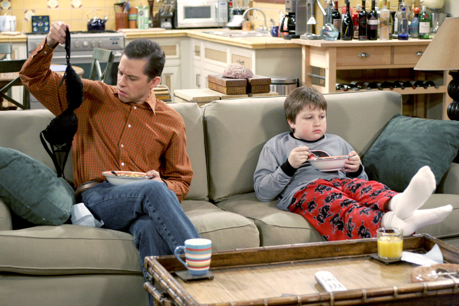Der Mittwochs-MannTwo and a Half Men - Mein cooler Onkel Charlie Der Mittwochs-Mann - The Last Thing You Want Is to Wind Up With a Hump Staffel 1, Episode 5 Die zwei Männer haben eine Menge Probleme zu besprechen: Charlie Sheen als Charlie Harper, Angus T. Jones als JakeBild: © SRF/Warner Bros.