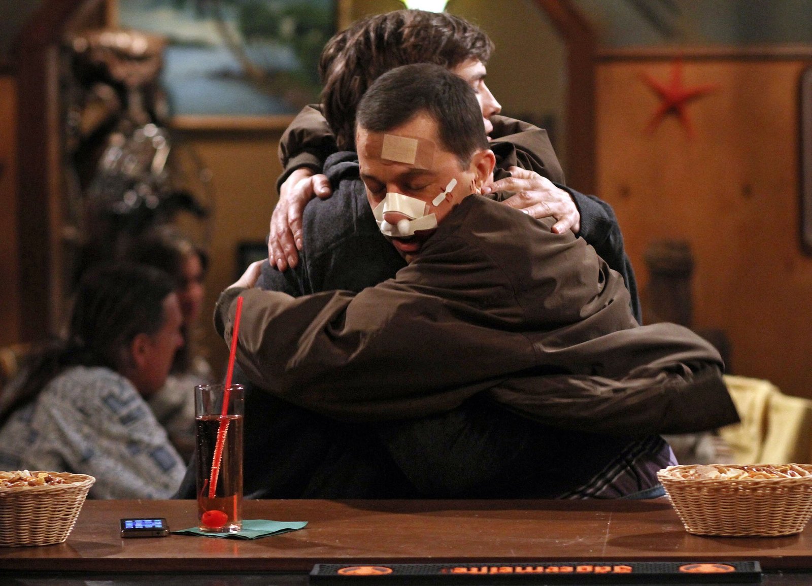 Danke für den GeschlechtsverkehrTwo and a Half Men Danke für den Geschlechtsverkehr - Thank You for the Intercourse Staffel 9, Episode 8 Unerwarteter Gefühlsausbruch: Jon Cryer als Alan Harper (M.), Ashton Kutcher als Walden Schmidt (ganz r.)Bild: © SRF/Warner Bros.