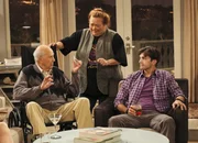 Strip PokerSpassbremse im Pyjama: Amber Tamblyn als Jenny Harper, Jon Cryer als Alan Harper, Ashton Kutcher als Walden SchmidtBild: © Copyright SRF/Warner Bros.