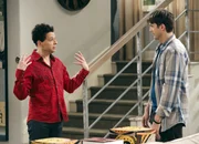 Die StanduhrTwo and a Half Men Ein Fischglas voller Glasaugen - A Fishbowl Full of Glass Eyes Staffel 9, Episode 10 Gemeinsamer Einkauf: Angus T. Jones als Jake Harper, Ashton Kutcher als Walden SchmidtBild: © SRF/Warner Bros.