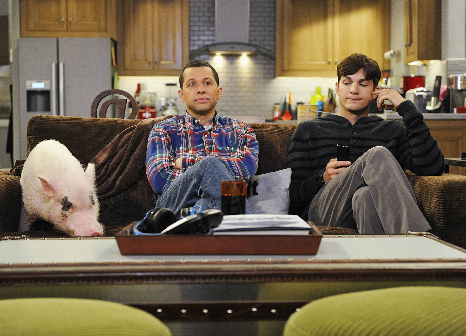 Hals- und BeinbruchSchweinischer Mitbewohner: Jon Cryer als Alan Harper und Ashton Kutcher als Walden SchmidtBild: © SRF/Warner Bros.