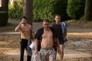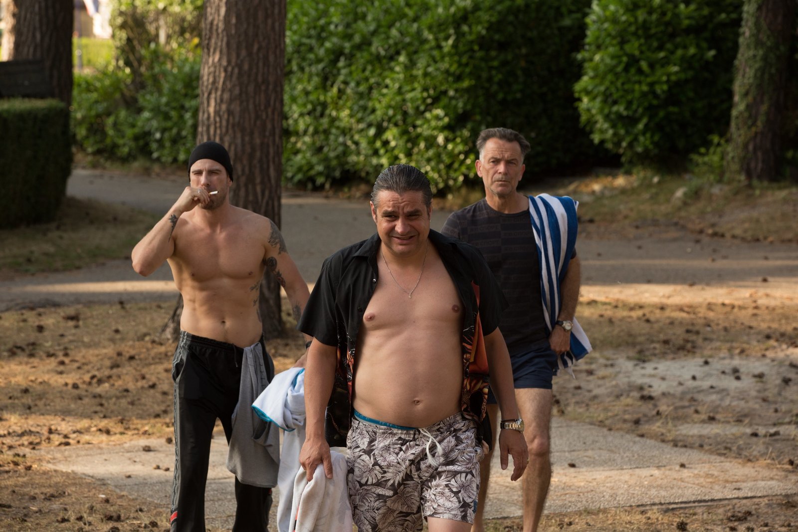 Folge 1Drogenboss Ferry Bouman (Frank Lammers, M.) umgibt sich auf dem Campingplatz gerne mit seinen Vertrauten John Zwart (Raymond Thiry, r.) und Jurgen Van Kamp (Kevin Janssens).Bild: © ZDF und Jo Voets.