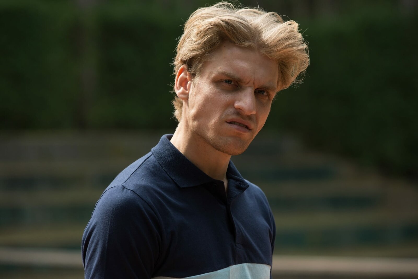 Folge 6Bastian Gerlach (Nico Ehrenteit, l.) gerät mit Gino Maldini (Michaël Pas, r.) wegen einer nicht gezahlten Provision für einen Drogendeal aneinander. Gerlachs Bodyguard (unbekannter Darsteller) ist zur Stelle, um notfalls einzugreifen.Bild: © ZDF und Jo Voets.