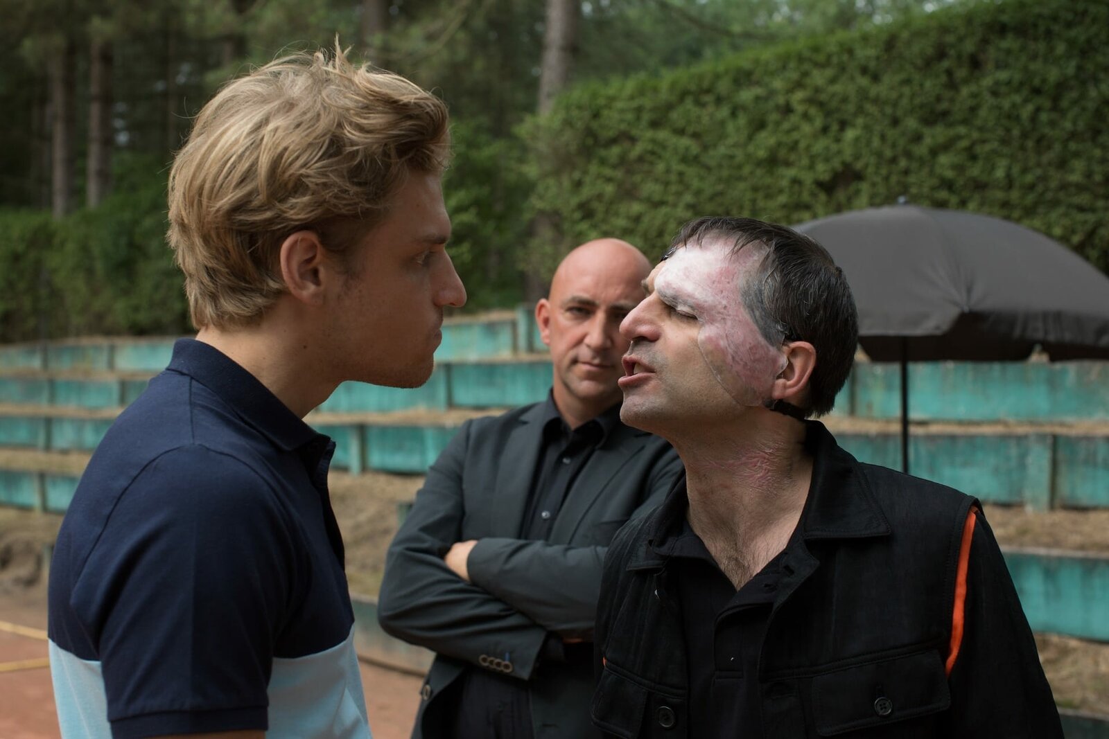 Folge 6Bastian Gerlach (Nico Ehrenteit, l.) gerät mit Gino Maldini (Michaël Pas, r.) wegen einer nicht gezahlten Provision für einen Drogendeal aneinander. Gerlachs Bodyguard (unbekannter Darsteller) ist zur Stelle, um notfalls einzugreifen.Bild: © ZDF und Jo Voets.