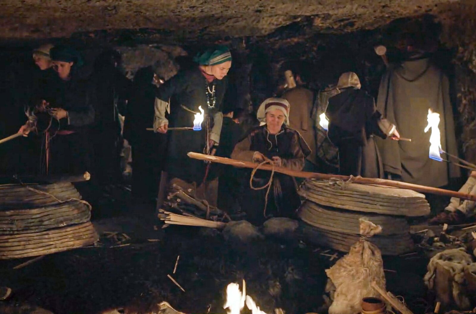Hallstatt und das weiße Gold - Die Salz-SagaUnten im Bergwerk packen alle mit an: Die Kinder sorgen mit Fackeln für Licht, die Männer schlagen die Salzblöcke aus der Wand und die Frauen (Fanny Krausz, Mi. li., Maria Hofstätter, Mi. re.) tragen sie aus dem Stollen. (Spielszene)Bild: © BR / © Carmen Treichl/Degn Film / © Carmen Treichl/Degn Film