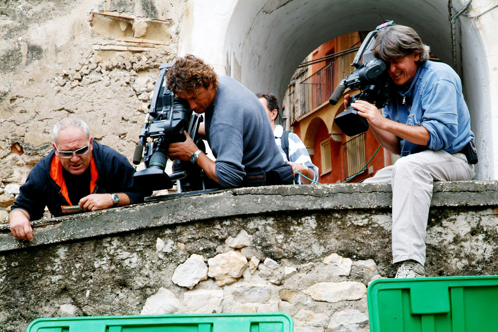 Haupttrainer Massimo Perla (links) gibt Anweisungen, neben ihm (v.l.n.r.) Kameramänner Stefano Pancaldi und Maurizio Felli.Bild: © ZDF und ORF/epo-film/epo-film/Michael Fally