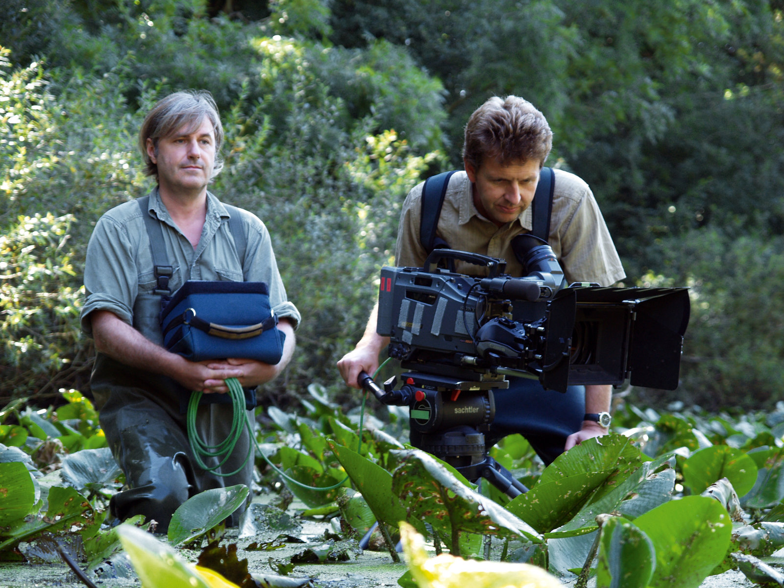 Fluss ohne Grenzen - Auenwildnis an der MarchUniversum: "Fluss ohne Grenzen - Auenwildnis an der March", Die March ist mit ihren Auwäldern, Altgewässern und Feuchtwiesen die schönste und artenreichste Flusslandschaft Mitteleuropas. Bedingt durch die spezielle geographische Lage hat sich an der March eine einzigartige Auenwildnis entwickelt und bis heute erhalten: Hier brüten die letzten Seeadler Österreichs und das einzige Kaiseradlerpaar, hier jagen Wildkatzen und Steppeniltisse und errichten Kormorane, Nachtreiher und Lachmöwen große Brutkolonien. Im Fluss leben Welse mit bis zu zwei Meter Länge, und auf den überschwemmten Wiesen laichen Wildkarpfen und Hechte in großer Zahl. Die Marchauen verbinden aber auch - wie ein Grünes Band - die Alpen mit den Karpaten. Regelmäßig wandern entlang dieses Korridors Elche, Bären, Rothirsche, Wildschweine oder Luchse. Dieser Film zeigt diese einmalige Landschaft in ihrer Vielfalt und Schönheit.Im Bild (v.li.): Franz Hafner (Regie), Dietrich Heller (Kamera).Bild: © 3sat