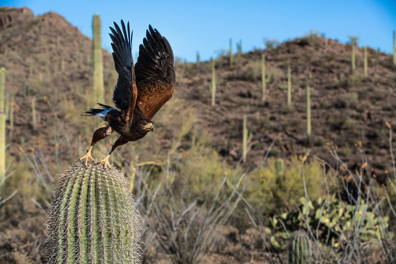 Planet Earth - Das Wunder Erde (2): Wüsten"Terra X: Eine Erde - viele Welten: Wüsten": Ein Wüstenbussard fliegt von einem Kaktus auf.Bild: © ORF2