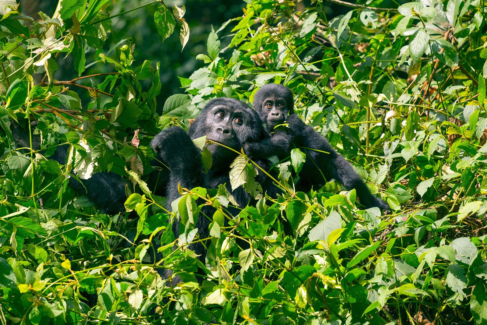 Tierbabys - Aufbruch ins Leben (2): Erste EntdeckungenNyakabara, ein acht Monate altes Berggorilla-Baby, muss eine Fahrt auf dem Rücken ihrer Mutter machen, während sie sich auf Nahrungssuche begibt, da sie noch nicht das Klettern im Bwindi Impenetrable Forest in Uganda gelernt hat.Bild: © Dominic Weston / ORF / BBC