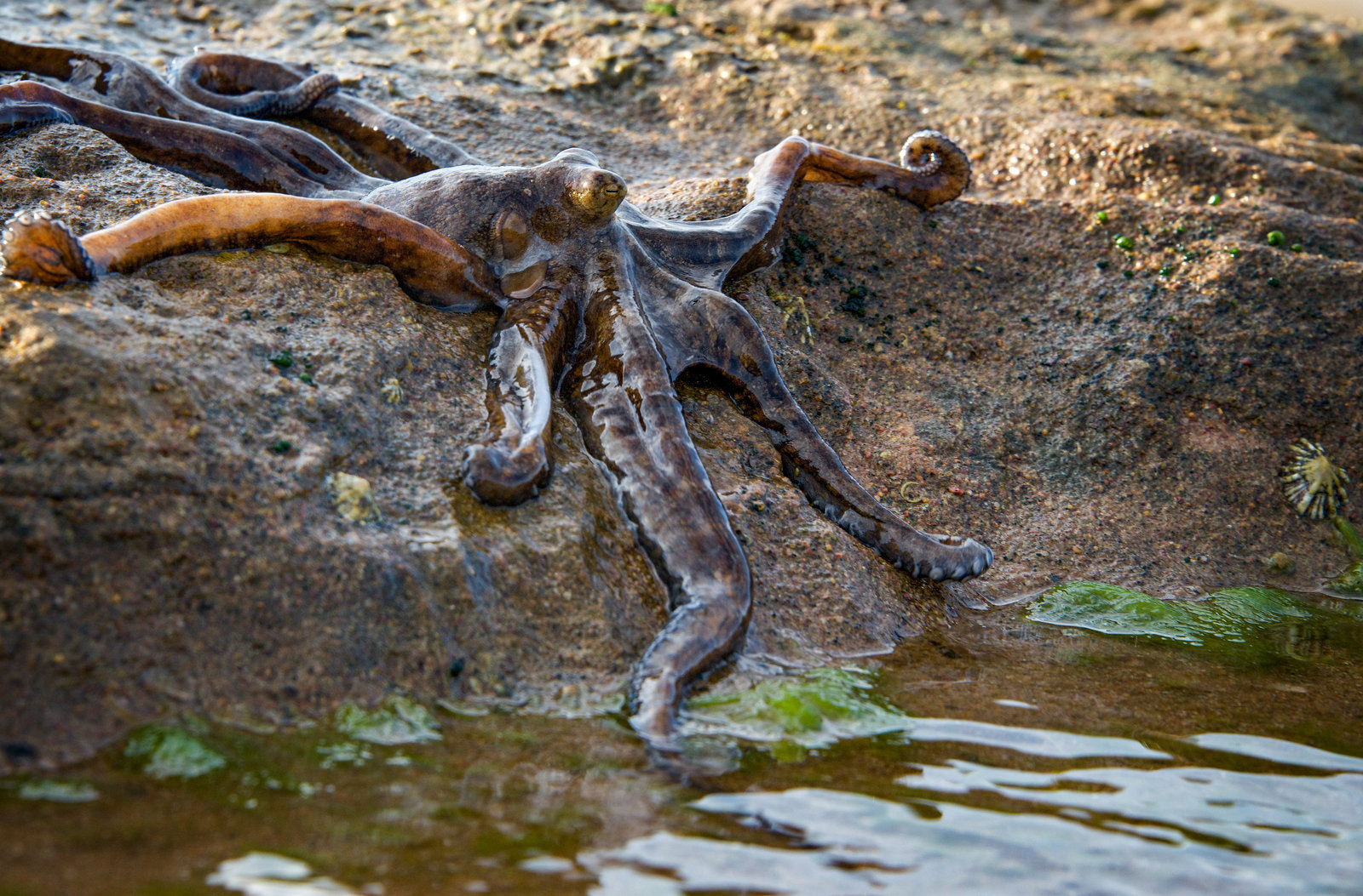 Universum: "Auf der Lauer - Die unglaublichen Strategien der Tiere", 6. Teil: Wettlauf mit der Zeit. Unaufh?rlich den Gezeiten ausgesetzt ist die K?ste ein Lebensraum mit ganz eigenen Gesetzen. Die Suche nach Nahrung wird zu einem Wettlauf, denn Gelegenheiten, Beute zu erhaschen, sind auf ein enges Zeitfenster begrenzt. Delphine katapultieren Fische ans Ufer, Seel?wen-Junge m?ssen sich vor hungrigen Orcas in Acht nehmen, Affen lassen sich die Austern schmecken, Oktopoden wandern am Strand entlang und W?lfe gehen auf Lachsfang. Ob Meeresbewohner, V?gel oder Beutegreifer vom Festland - f?r alle ist in dieser unsteten Umgebung eines entscheidend: das perfekte Timing.Im Bild: die Abdopus Krake lebt in Nord-Australien, ist die einzige Kraken Art die bei Ebbe auch an Land auf Beutejagd geht, wurde erst 2011 entdeckt.Bild: © ORF