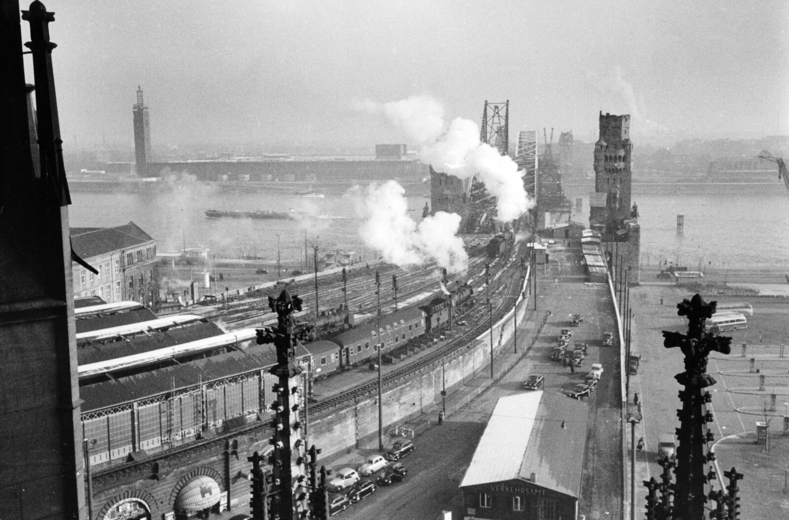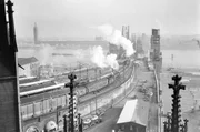 Wir sind wieder werBlick auf den Kölner Hauptbahnhof mit der Hohenzollernbrücke - im Hintergrund noch die Zerstörungen des Krieges.Bild: © WDR/dpa/Bildarchiv Eisenbahnstiftung/Theo Felten