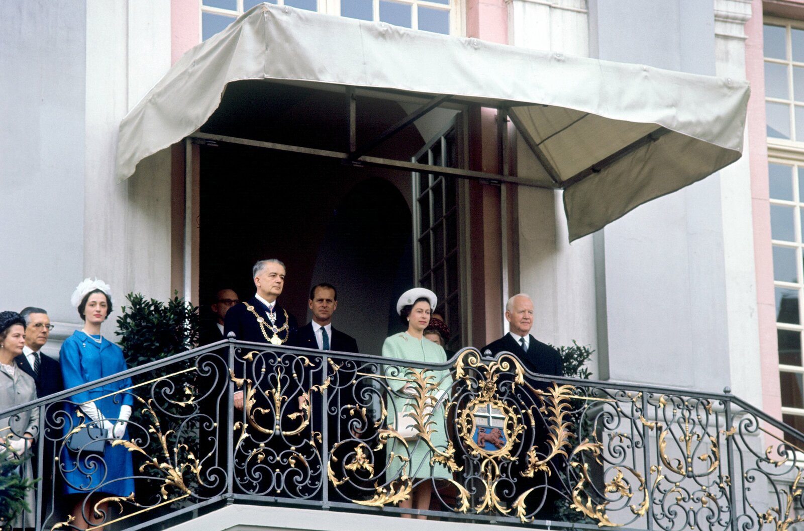 Weg mit dem Grauschleier - 1965-1967Mitte der 60er kam die englische Königin Elizabeth II. zu einem Staatsbesuch nach Deutschland. - (Archivfoto: Königin Elizabeth II. und ihr Gatte Prinz Philip (3.v.r.) stehen am 19.05.1965 auf dem Balkon des Rathauses in Bonn. Rechts neben der Queen Bundespräsident Heinrich Lübke, links neben Philip der Bonner Oberbürgermeister Wilhelm Daniels.Bild: © WDR/picture alliance/Manfred Rehm