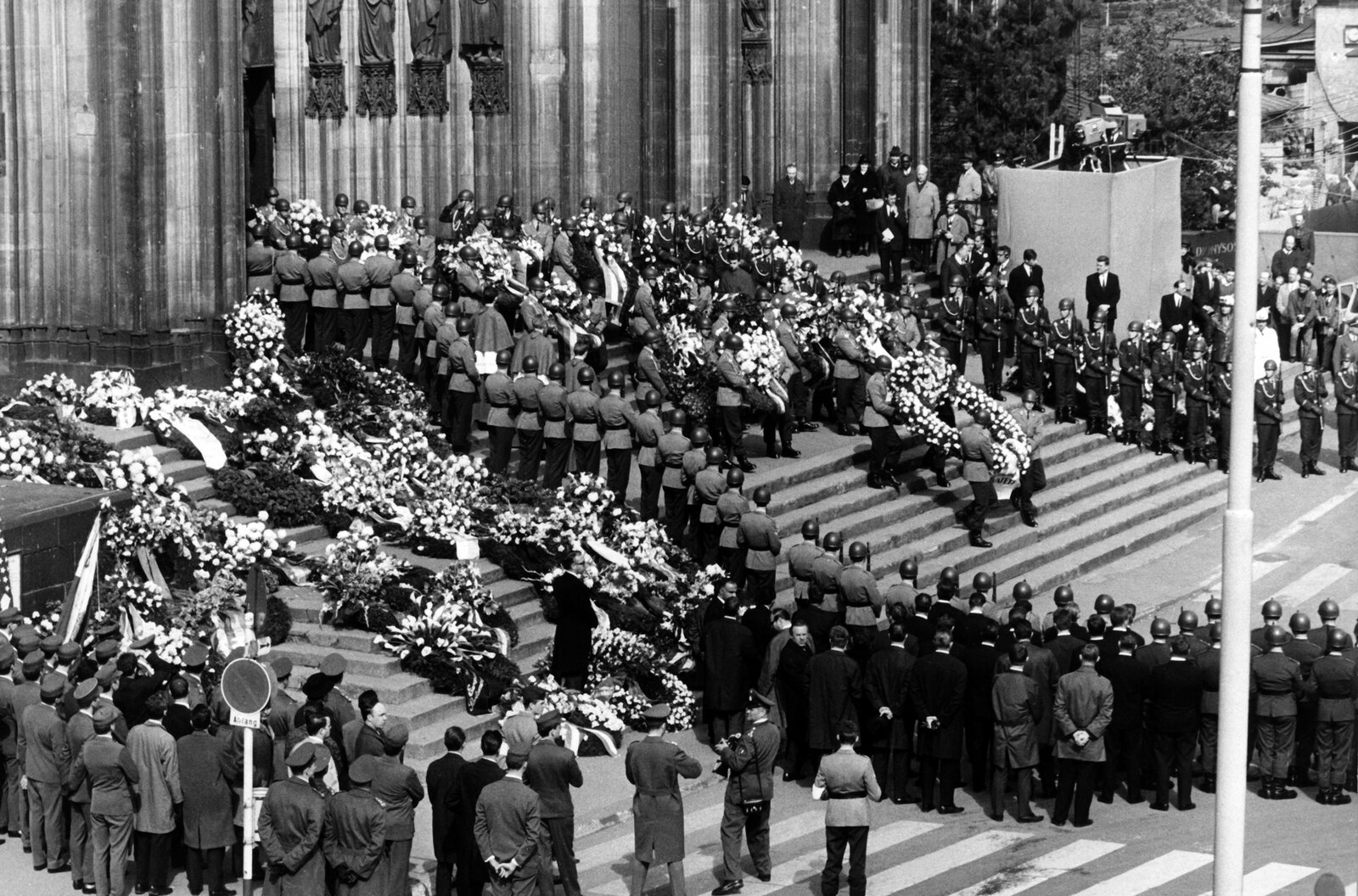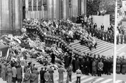 Weg mit dem Grauschleier - 1965-1967Der Tod von Altbundeskanzler Konrad Adenauer am 19. April 1967 markiert endgültig das Ende der Nachkriegszeit. (Archivfoto, Köln nahm Abschied von Konrad Adenauer Blick auf das Südportal des Kölner Doms am 25.04.1967, als Offiziere der Bundeswehr Kränze heraustragen. Mit einem Pontifikal-Requiem im Hohen Dom zu Köln nahmen an diesem Tag hohe Politiker und Staatsmänner aus aller Welt, sowie eine sehr große Trauergemeinde Abschied von Konrad Adenauer. Nach den Trauerfeierlichkeiten brachte ein Schnellboot der Bundesmarine den Sarg Adenauers nach Rhöndorf, wo er auf dem Waldfriedhof im engen Familienkreis beigesetzt wurde.)Bild: © WDR/picture alliance/Roland Witsch