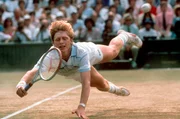 Der 17-jährige Boris Becker hechtet während des Turniers in Wimbledon im Juli 1985 hinter einem Ball her (Archivfoto vom Juli 1985). Als jüngster Spieler und erster Deutscher überhaupt gewann der ungesetzte Boris Becker am 7. Juli 1985 spektakulär in vier Sätzen das Wimbledon-Finale.