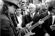 WDR Fernsehen HINTERM HORIZONT GEHT'S WEITER - 1987, "Aus der Reihe "Unser Land in den 80ern"", am Freitag (28.09.18) um 20:15 Uhr. Rockmusiker Udo Lindenberg (l) überreichte dem ehemaligen SED-Generalsekretär Erich Honecker (M) bei dessen Besuch 1987 in Wuppertal eine - laut Lindenberg - "nicht ganz billige Gitarre" mit der Aufschrift "Gitarren statt Knarren". © WDR/dpa/Franz-Peter Tschauner, honorarfrei - Verwendung gemäß der AGB im engen inhaltlichen, redaktionellen Zusammenhang mit genannter WDR-Sendung bei Nennung "Bild: WDR/dpa/Franz-Peter Tschauner" (S3). WDR Presse und Information/Redaktion Bild, Köln, Tel: 0221/220 -7132 oder -7133, Fax: -777132, bildredaktion@wdr.de