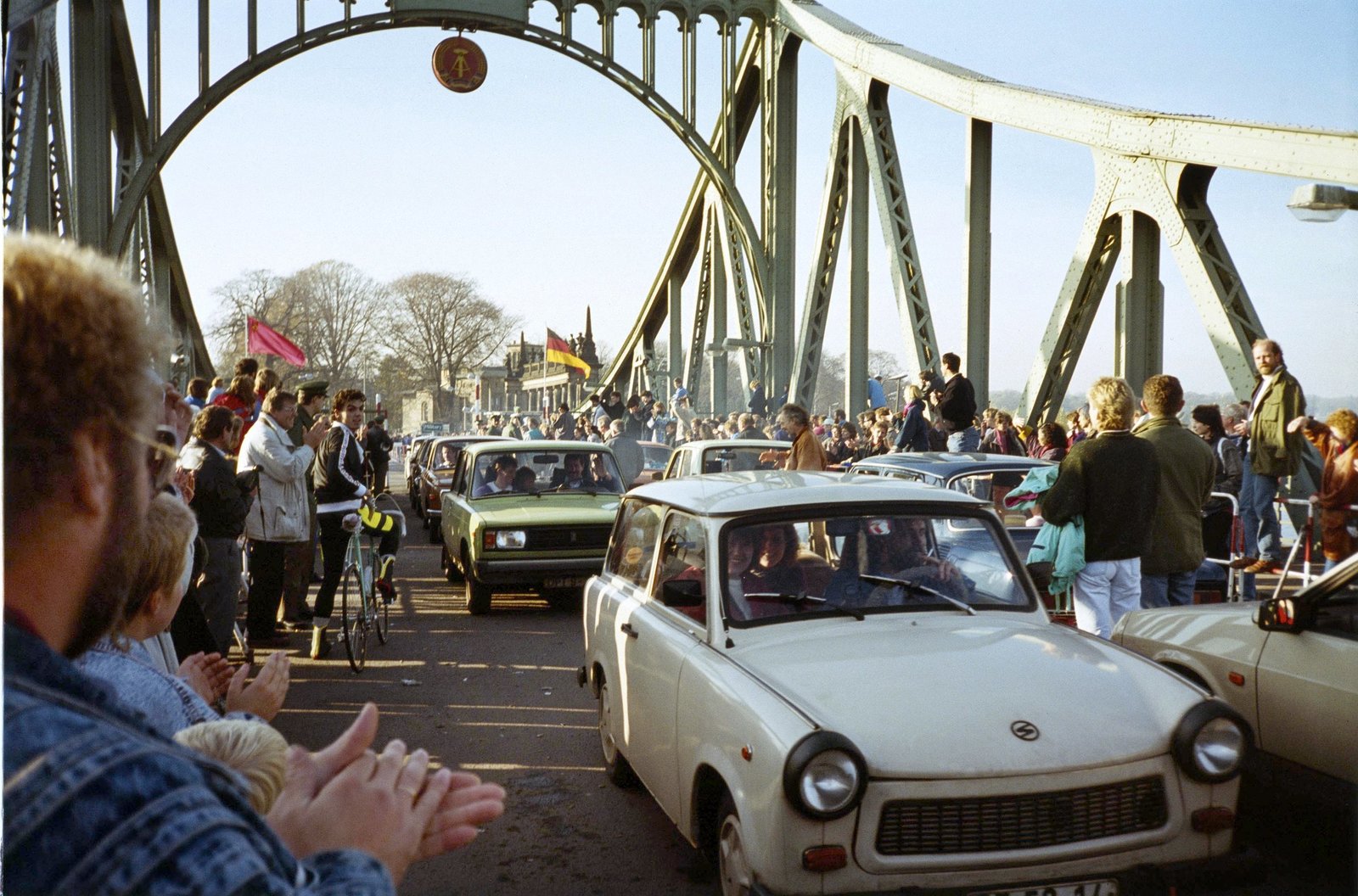 Doch besonders eingebrannt in die Erinnerung der Menschen haben sich 1989 die Bilder nach der deutsch-deutschen Grenzöffnung. DDR-Bürger kamen nach NRW - und brachten ihre Trabis mit. Öffnung der DDR-Grenze: am Grenzübergang Glienicker Brücke werden die DDR-Bürger von West-Berlinern begrüßt (Archivfoto Potsdam, 10.11.1989)