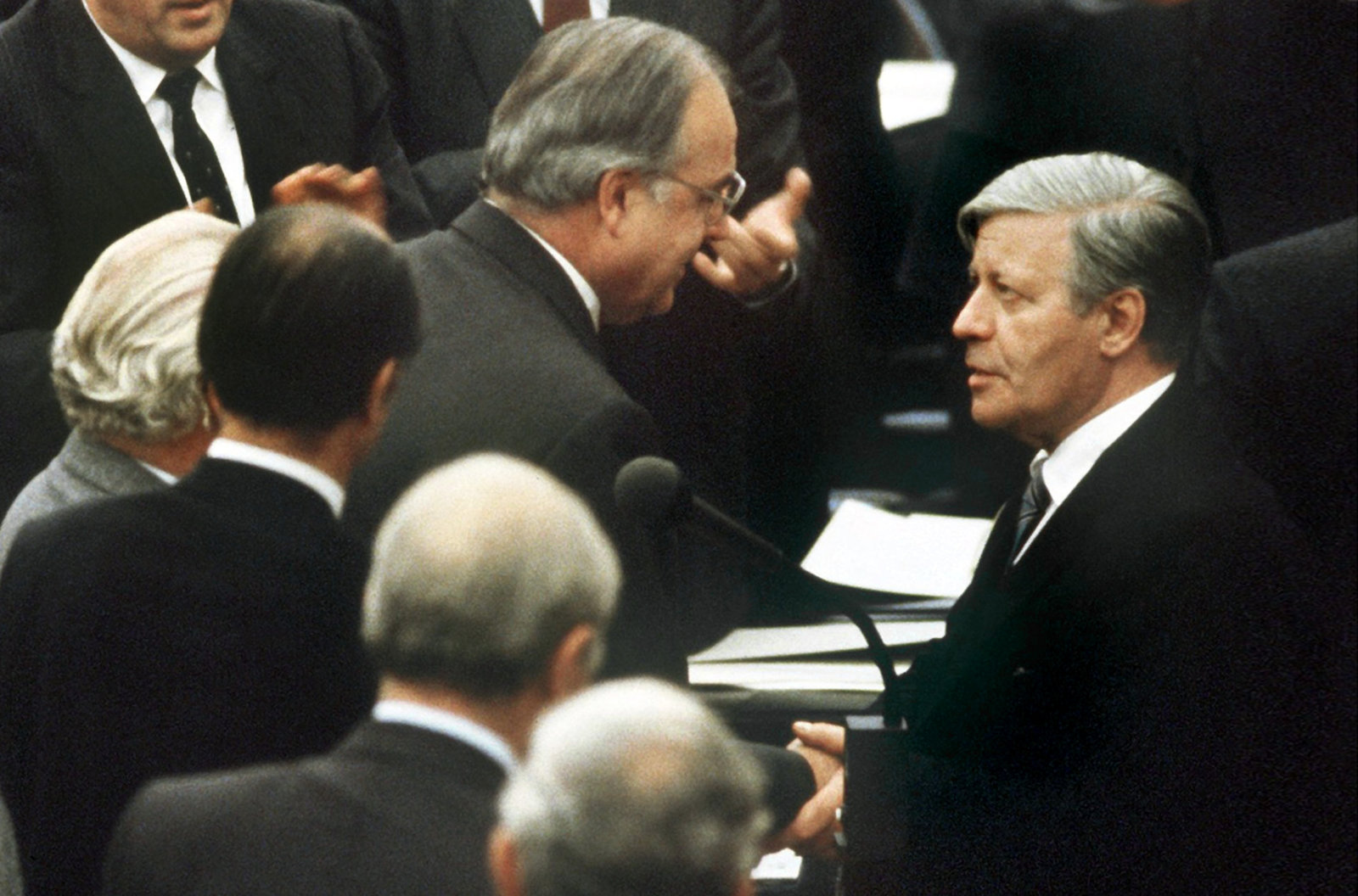 Ende des Jahres platzt die sozialliberale Koalition in Bonn: Der Deutsche Bundestag spricht Helmut Schmidt das Misstrauen aus, die Ära Kohl beginnt. - Der gestürzte Bundeskanzler Helmut Schmidt (r, SPD) beglückwünscht am 1.10.1982 seinen Nachfolger Helmut Kohl (M) zu dessen Wahl.