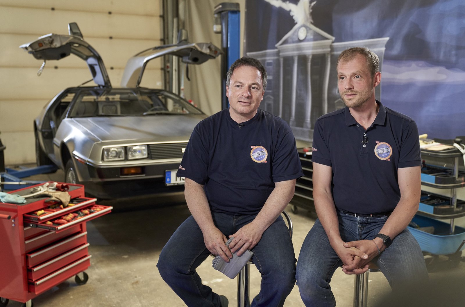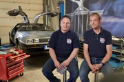 Josef Hesse und Oliver Wirtz (l) erfüllten sich einen Kindsheitstraum und bauten gemeinsam einen Delorean zur "Zeitmaschine" um, nach dem Vorbild im Film "Zurück in die Zukunft".
