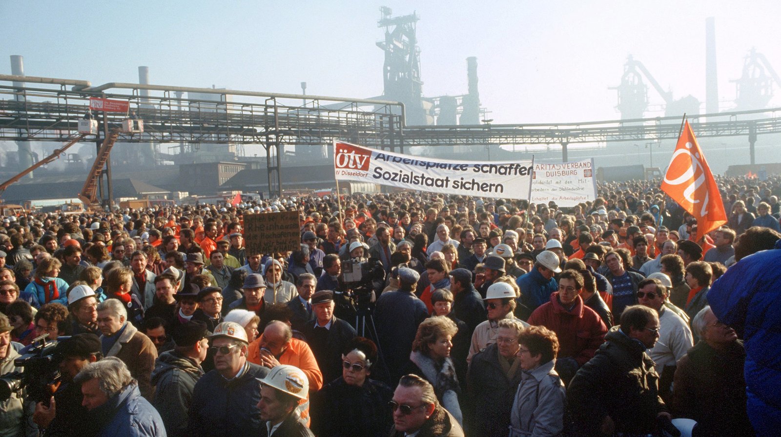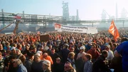 WDR Fernsehen HINTERM HORIZONT GEHT'S WEITER - 1987, "Aus der Reihe "Unser Land in den 80ern"", am Freitag (28.09.18) um 20:15 Uhr. Stahlarbeiter demonstrieren am 9. Dezember 1987 vor dem Werksgelände des Krupp-Stahlwerkes in Duisburg-Rheinhausen für den Erhalt der Hütte und der Arbeitsplätze. Nach jahrelangem Tauziehen wurde das Stahlwerk Duisburg-Rheinhausen am 15.8.1993 endgültig geschlossen. © WDR/dpa, honorarfrei - Verwendung gemäß der AGB im engen inhaltlichen, redaktionellen Zusammenhang mit genannter WDR-Sendung bei Nennung "Bild: WDR/dpa" (S3). WDR Presse und Information/Redaktion Bild, Köln, Tel: 0221/220 -7132 oder -7133, Fax: -777132, bildredaktion@wdr.de