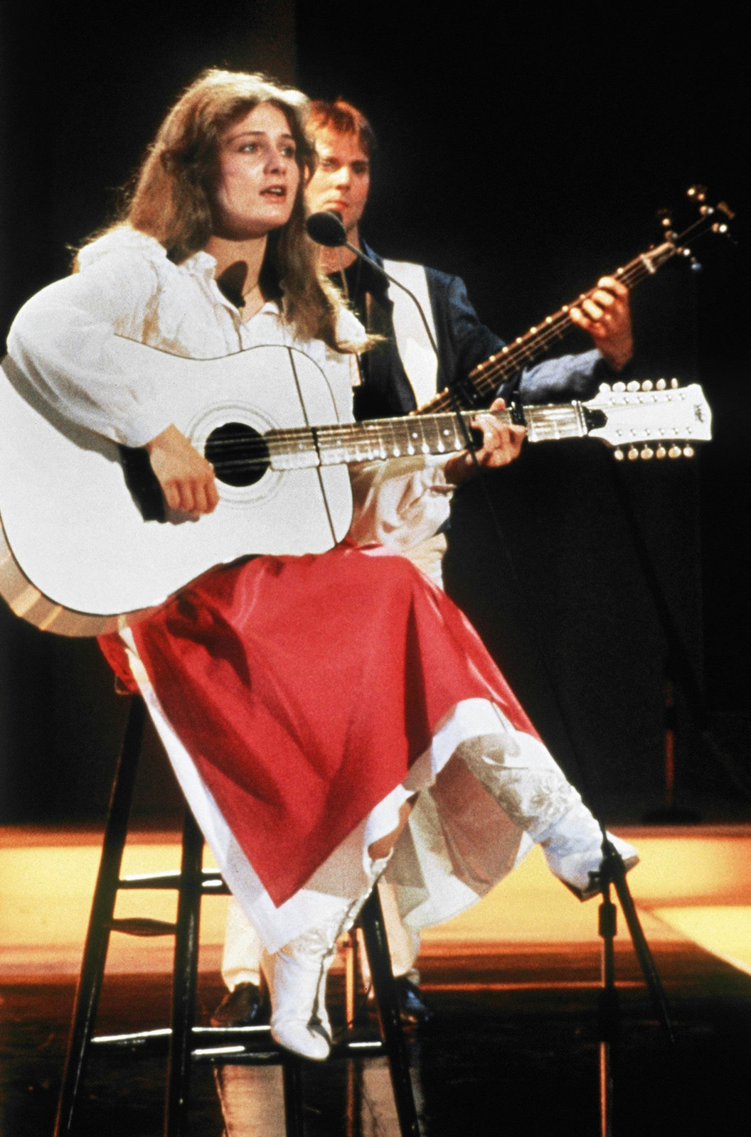 Die 17-jährige deutsche Sängerin Nicole Hohloch gewinnt mit ihrem Lied "Ein bisschen Frieden" den Europäischen Schlagerwettbewerb Grand Prix d'Eurovison de la Chanson in Harrogate, Großbritannien (Archivfoto vom 24.04.1982).