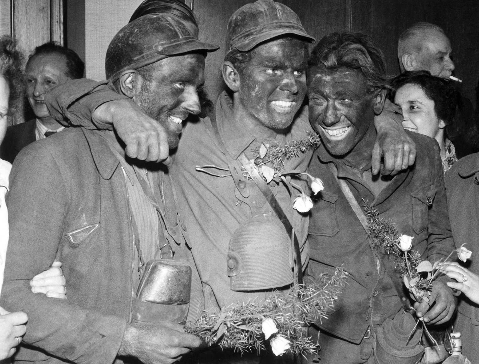 Ein schweres Grubenunglück ließ ganz NRW mit Gelsenkirchen 1984 bangen. Auf der Zeche Consolidaton wurden zehn Bergleute bei einem schweren Grubenunglück verschüttet. Ein Drama tief unter der Erde, bei dem nur wenige der Verschütteten gerettet werden konnten. - Drei der geretteten Bergleute der Zeche Dahlbusch . Die unter Tage eingeschlossenen Kumpel waren mit Hilfe eines eigens konstruierten Stahlblechzylinders, der genannten Dahlbusch-Bombe, befreit worden. (Archivfoto, Gelsenkirchen, 12.05.1955)