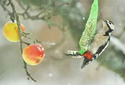 Buntspecht - Rund 1.400 Tonnen Vogelfutter werden in Deutschland jeden Winter in unsere Gärten verfüttert.Bild: © ORF/NDR Naturfilm/Jan Haft