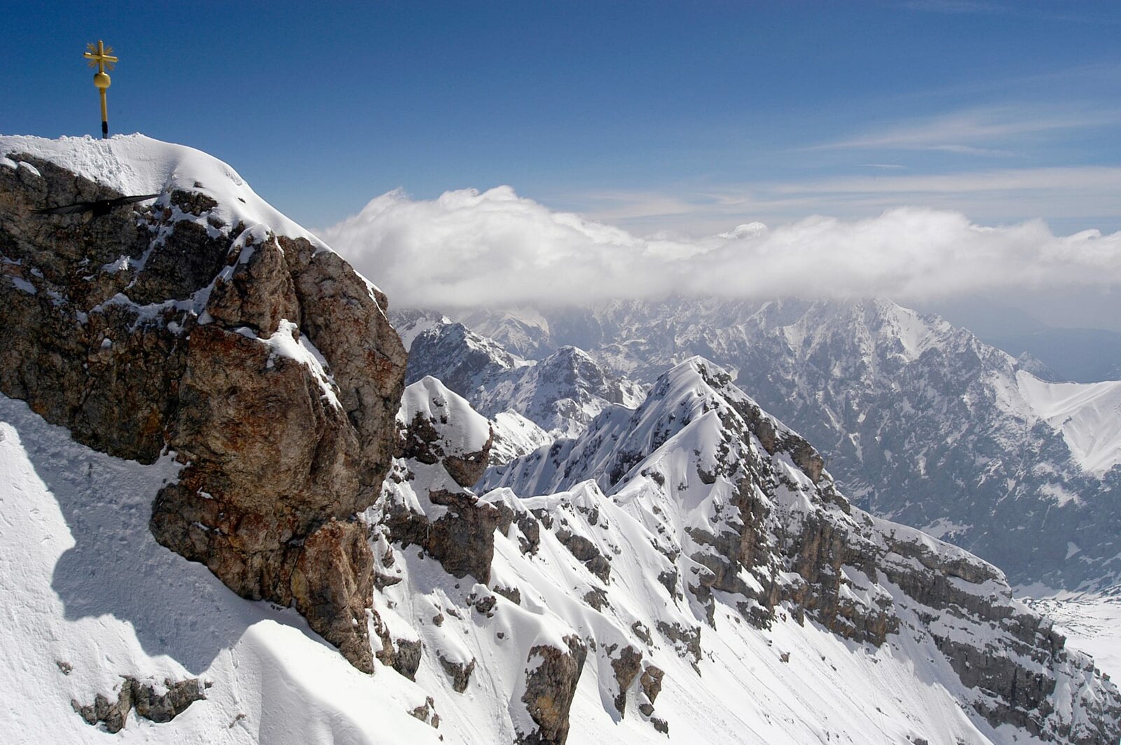 Gipfelkreuz mit Blick auf das Rheintal und den Grat vom Höllental.Bild: © ORF/WEGA - Film