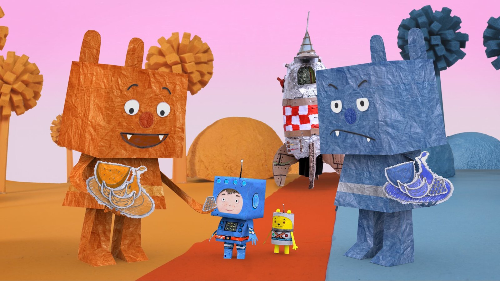 Raketenflieger Timmi: "Der Streitplanet"Raktenflieger Timmi und Teddynaut sind auf dem Streitplaneten, der in zwei Hälften geteilt ist. Die eine ist blau, die andere orange, wie die zwei Bewohner, die in den Hälften leben.Bild: © rbb/MDR/MotionWorks GmbH