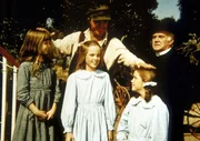 (v.l.n.r.) Christy (Tracie Savage), Mary (Melissa Sue Anderson), Jones (Chuck McCann), Laura (Melissa Gilbert) und Reverend Alden (Dabbs Greer) freuen sich über die neue Glocke.