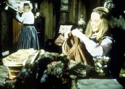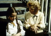 Die alleinstehende, alte Dame, Mrs. Flannery (Barbara Townsend, l.) teilt Laura Ingalls-Wilder (Melissa Gilbert, r.) mit, dass sie ihr großes Haus vererben will.
