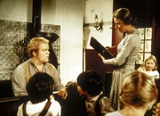 Caroline (Karen Grassle, stehend) muss mit Entsetzen feststellen, dass Abel McKay (Dirk Blocker, l.) weder schreiben noch lesen kann.