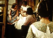 (v.l.n.r.) Mary (Melissa Sue Anderson), Caroline (Karen Grassle) und Charles (Michael Landon) bestaunen den wenige Stunden alten Frederik. Laura (Melissa Gilbert) ist nicht besonders begeistert.