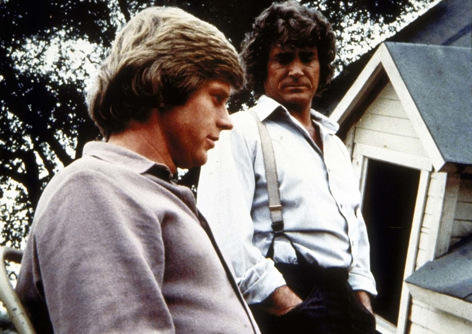 Vom Schicksal gebeutelt (1)Charles Ingalls (Michael Landon, r.) betrachtet sich mit seinem Schwiegersohn Almanzo Wilder (Dean Butler, l.) dessen Haus, das bei einem Tornado zerstört wurde.Bild: © Sat.1 Gold