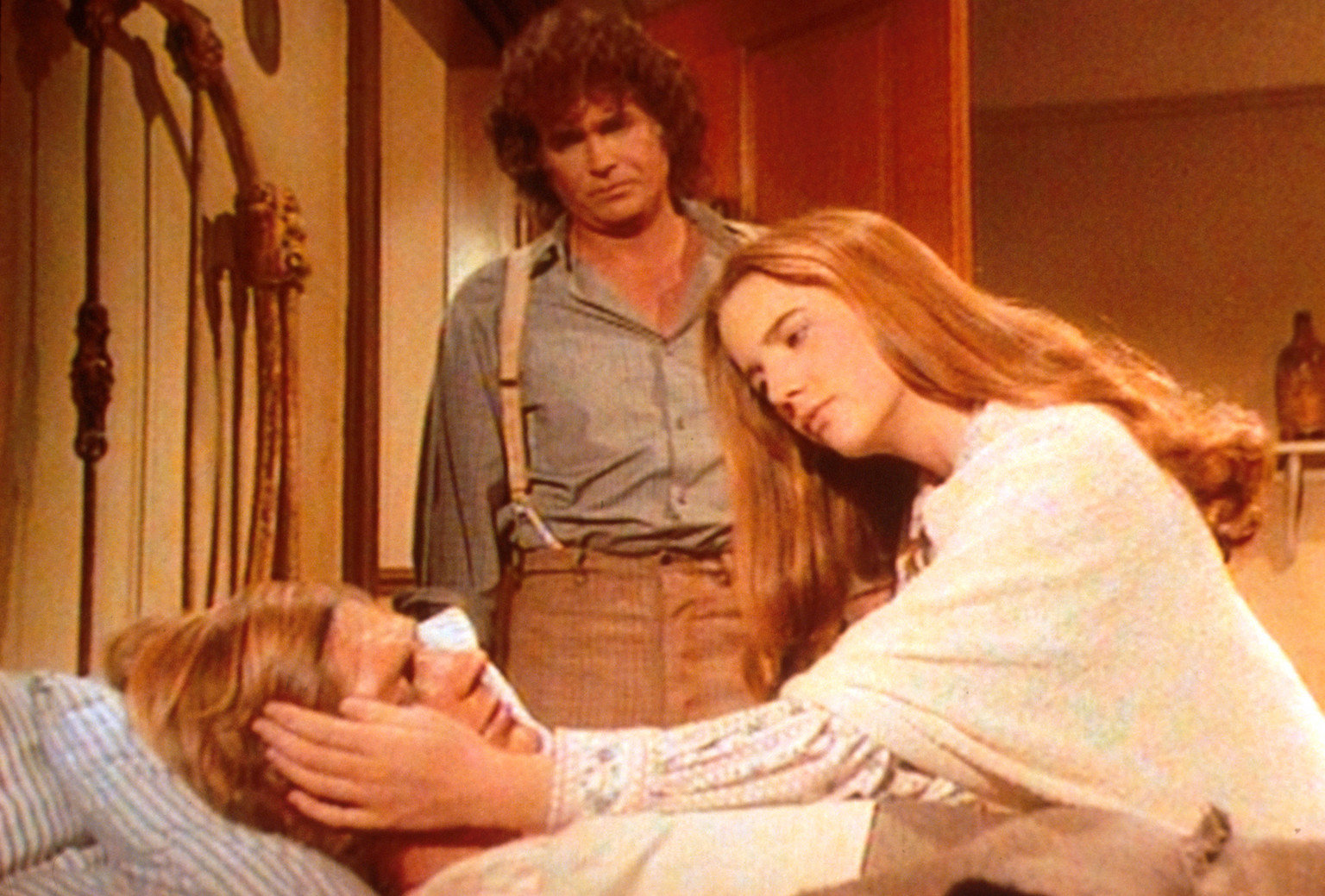 Er liebt mich, er liebt mich nicht (2)Almanzo (Dean Butler, liegend) ist an einer schweren Lungenentzündung erkrankt. Laura (Melissa Gilbert, r.) und Charles (Michael Landon, M.) sind aus Walnut Grove angereist, um den Kranken zu pflegen.Bild: © ProSieben Media AG © Worldvision
