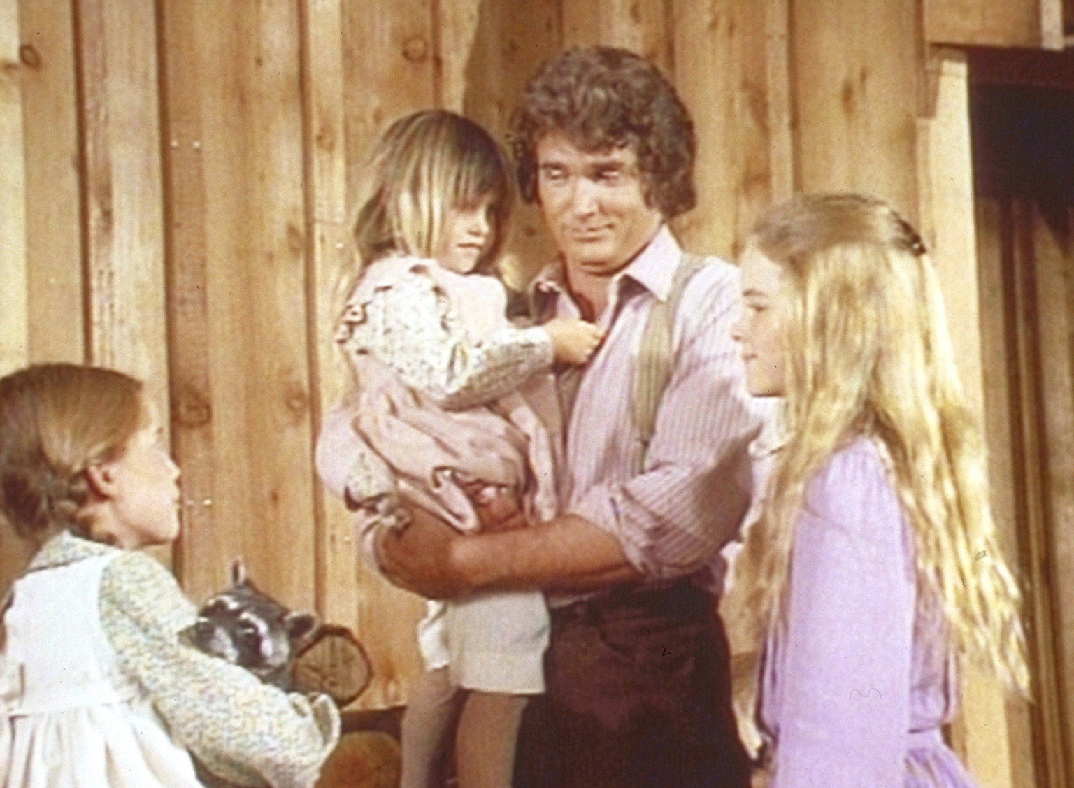 Der WaschbärIn Einverständnis ihres Vaters (Michael Landon, 2.v.r.) schenkt Mary (Melissa Sue Anderson, r.) ihrer Schwester Laura (Melissa Gilbert, l.) einen kleinen Waschbären.Bild: © ProSieben Media AG © Worldvision
