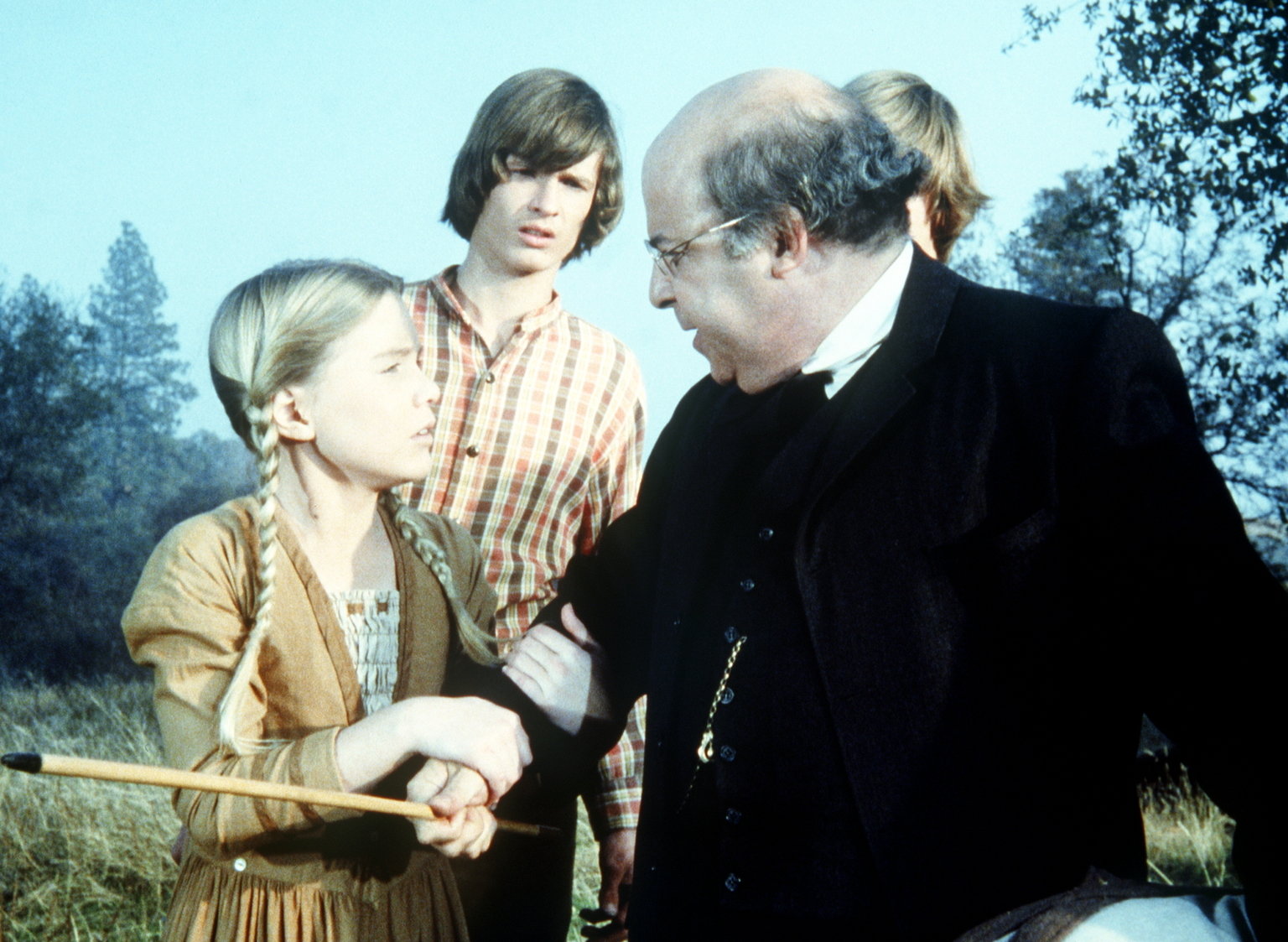 ErinnerungenLehrer Watson (Sorrel Booke, r.) will Charles Ingalls mit Stockhieben bestrafen. Caroline (Katy Kurtzman, l.) versucht, dies zu verhindern.Bild: © ProSieben Media AG © Worldvision