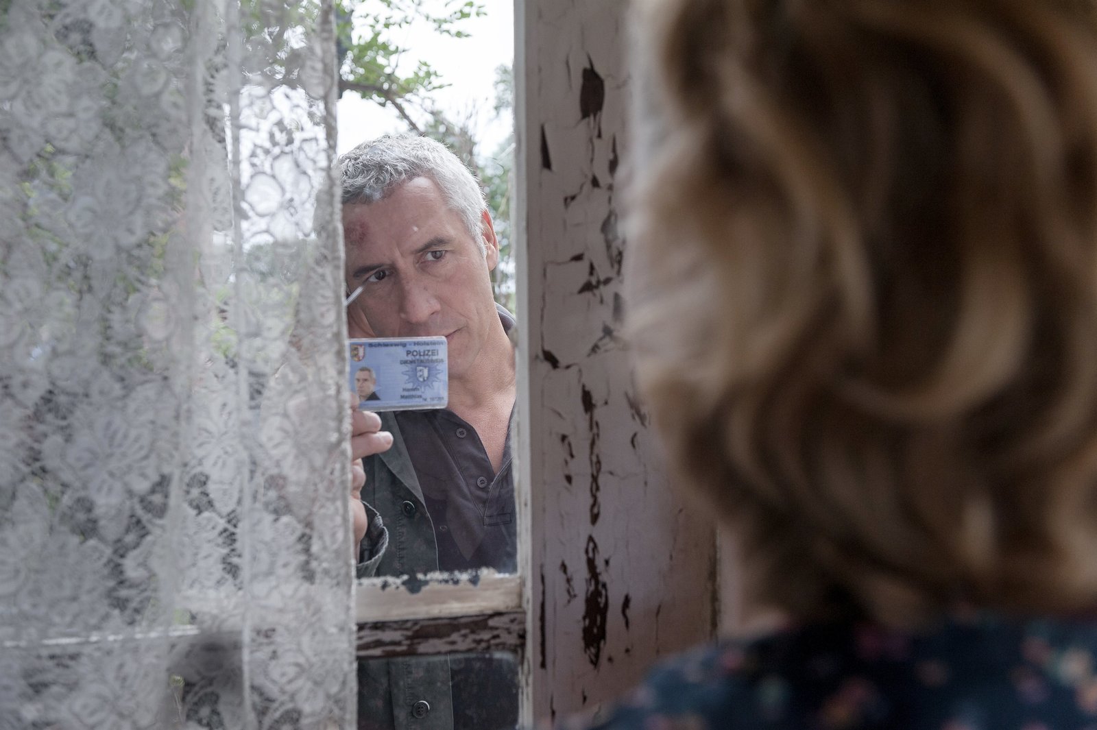 Der Mörder unter unsMatthias Hamm (Ralph Herforth, l.) muss sich mithilfe seines Ausweises Zugang zum Haus von Sonja Wolf (Christine Schorn, r.) verschaffen.Bild: © ORF 2