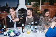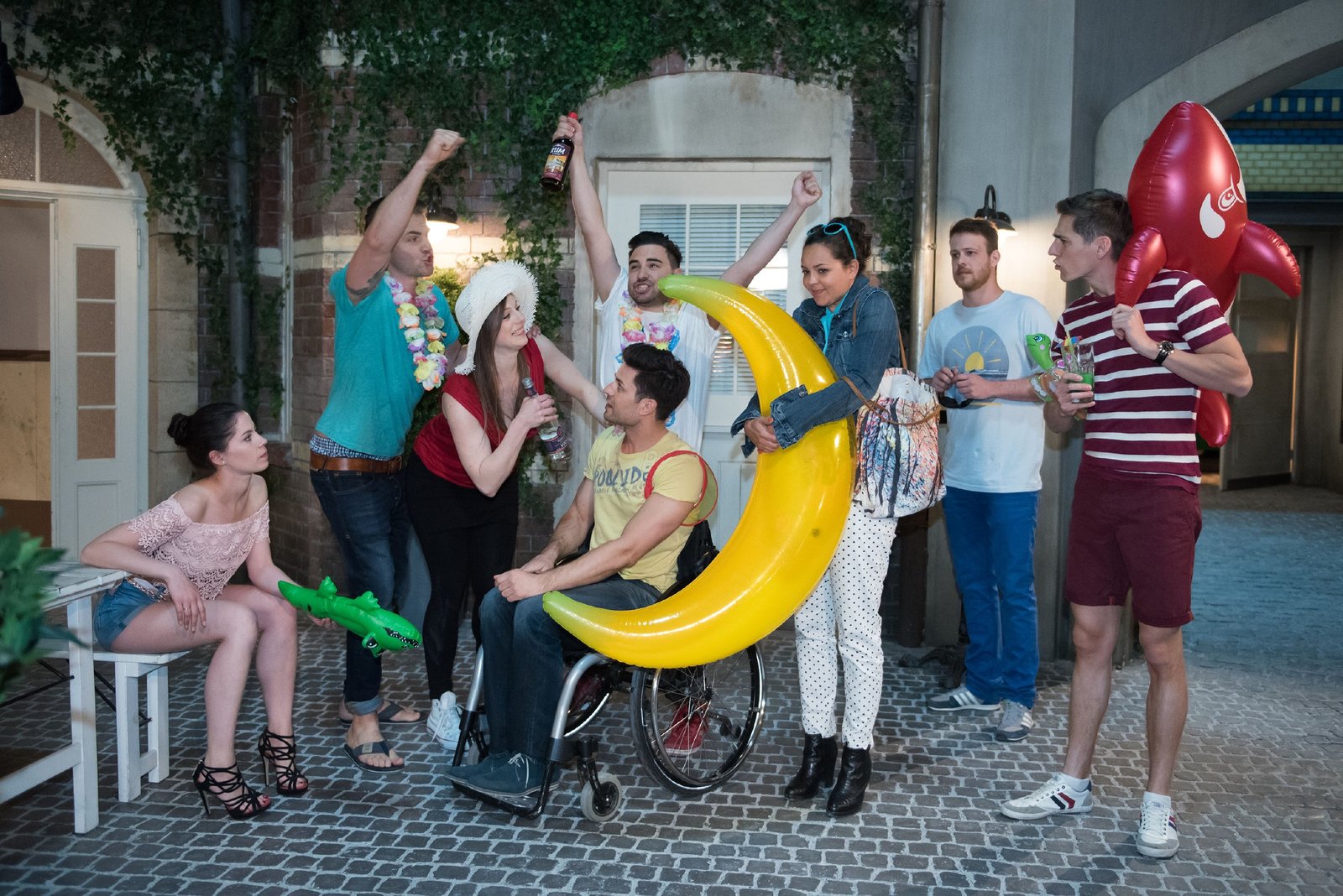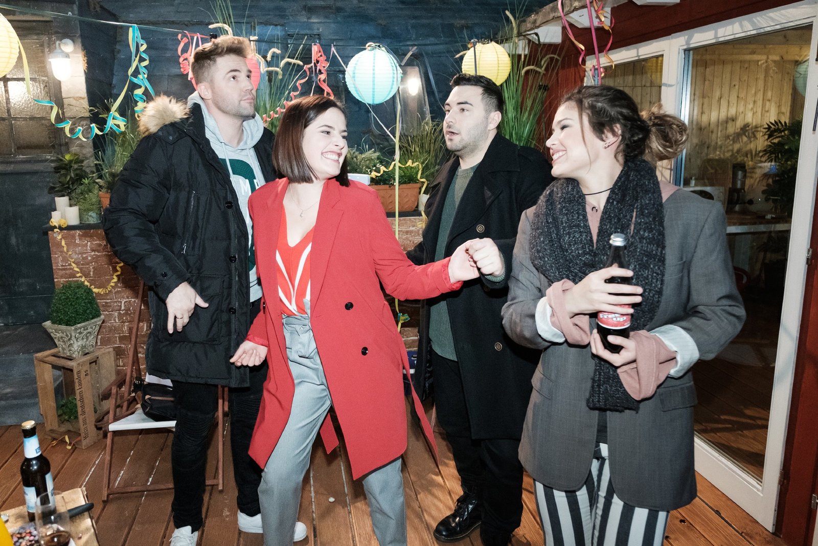 Valentins zweite ChanceCaro (Ines Kurenbac, 3.v.r.) lässt sich überreden, mit (v.l.) Sina (Valea Katharina Scalabrino), Bambi (Benjamin Heinrich), Elli (Nora Koppen), Easy (Lars Steinhöfel), Paco (Milos Vukovic, vorne), Tobias (Patrick Müller) und Ringo (Timothy Boldt) weiterzufeiern.Bild: © RTL / Stefan Behrens