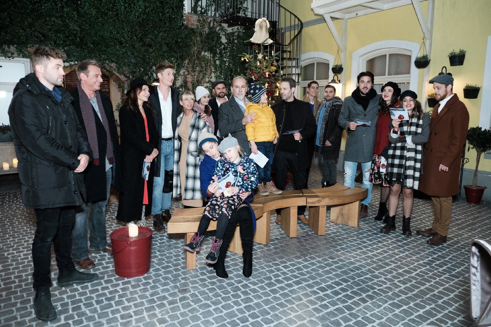Die Weihnachtsfeier im "Schiller"Die Schillerallee-Bewohner (v.l.: Benjamin Heinrich, Kai Noll, Tabea Heynig, Yannik Meyer, Isabell Hertel, Josephine Becker, Milos Vukovic, Luca Maric, Noah, Ben Ruedinger, Timothy Boldt, Lars Steinhöfel, Alexander Milo, Antonia Michalsky, Sharon Berlinghoff, Patrick Müller; vorne Valea Scalabrino mit Amelie) wahren die Weihnachtstradition und singen gemeinsam im Innenhof.Bild: © TVNOW / Stefan Behrens