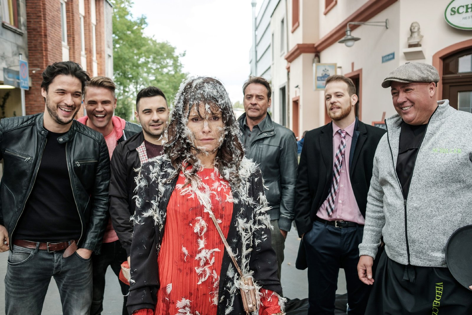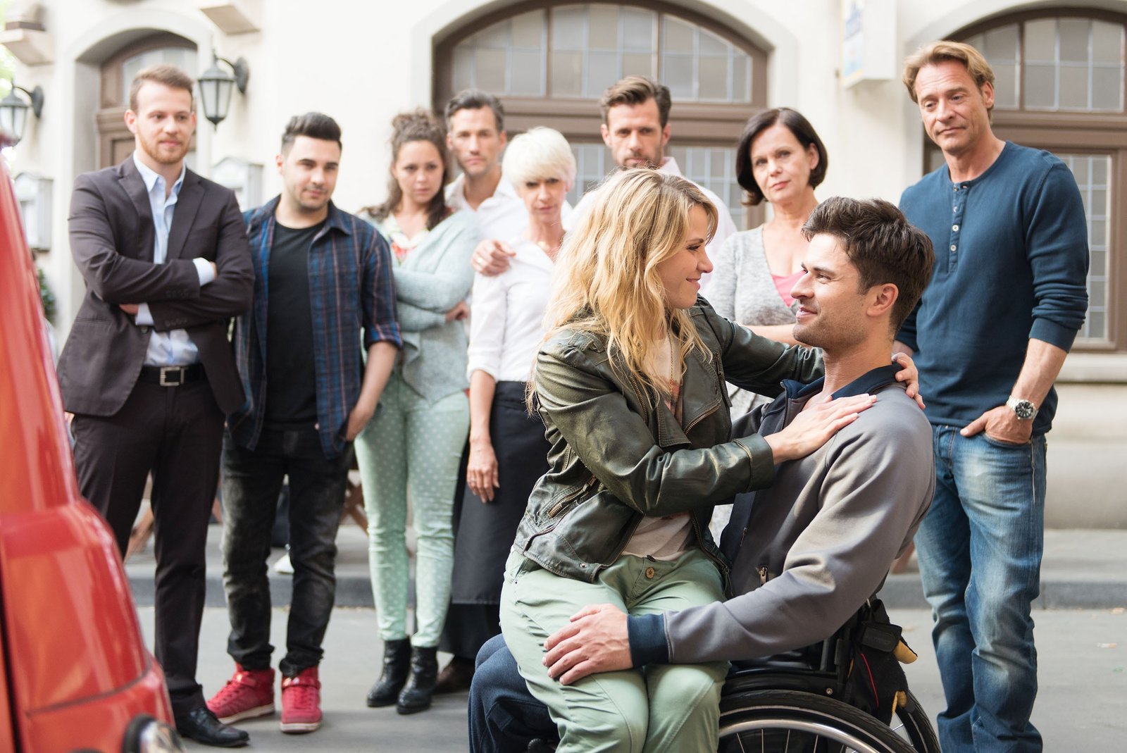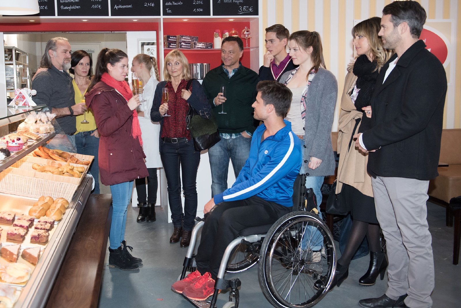 Plötzliche NäheSina (Valea Katharina Scalabrino, vorne l.) bedankt sich bei (v.r. hinten) Robert (Luca Maric), Irene (Petra Blossey), Fiona (Olivia Burkhart), Susanne (Petra Nadolny), Uli (Frank Voß), Ringo (Timothy Boldt), Elli (Nora Koppen), Eva (Claudelle Deckert), Till (Ben Ruedinger) und Paco (Milos Vukovic, vorne) für ihre Unterstützung.Bild: © RTL / Stefan Behrens