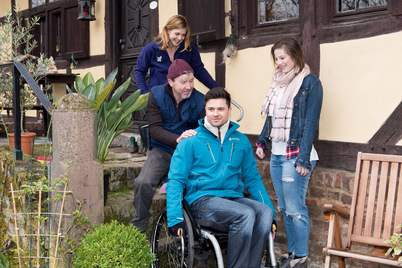 Kritische ÄußerungenElli (Nora Koppen, r.) und Paco (Milos Vukovic, 2.v.r.) sind endlich in Billerbeck angekommen und werden herzlich von Ellis Eltern Iris (Tina Eschmann) und Bernd (Hans Kieseier) begrüßt. Ein Hindernis für Paco und seinen Rollstuhl auf dem Hof wird von Ellis Vater pragmatisch behoben.Bild: © RTL / Stefan Behrens