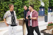 Easy (Lars Steinhöfel, r.) muss den kriminellen Nachwuchs-Rapper Billowitsch (Oskar Redfern, l.) fotografieren und ist erleichtert, als er im Beisein von Tobias (Patrick Müller) den richtigen Ton zu seinem jugendlichen Model findet.Bild: © TVNOW