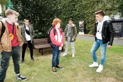 Romantischer HeiratsnatragBritta (Tabea Heynig) bekommt eine Lektion von Rufus (Kai Noll, 3.v.r.) erteilt und muss den Spott von (v.l.) Jakob (Alexander Milo), Bambi (Benjamin Heinrich) und Easy (Lars Steinhöfel), Tobias (Patrick Müller, 2.v.r.) und Roger (Ramon Ademes) ertragen.Bild: © MG RTL D / Stefan Behrens