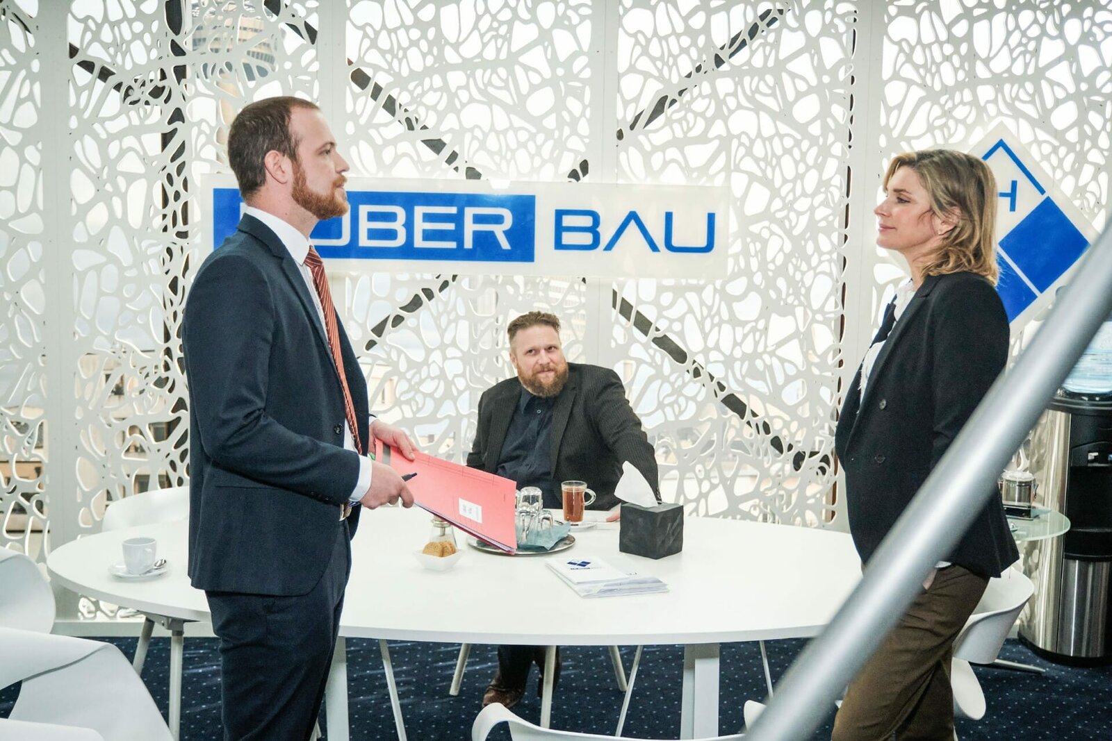 Kampf gegen die SuchtTill (Ben Ruedinger, M.) gerät unter Druck, als Tobias (Patrick Müller) ihn bei einer Zeugenbestechung (r. Komparsin) erwischt.Bild: © MG RTL D / Dennis-Alexande