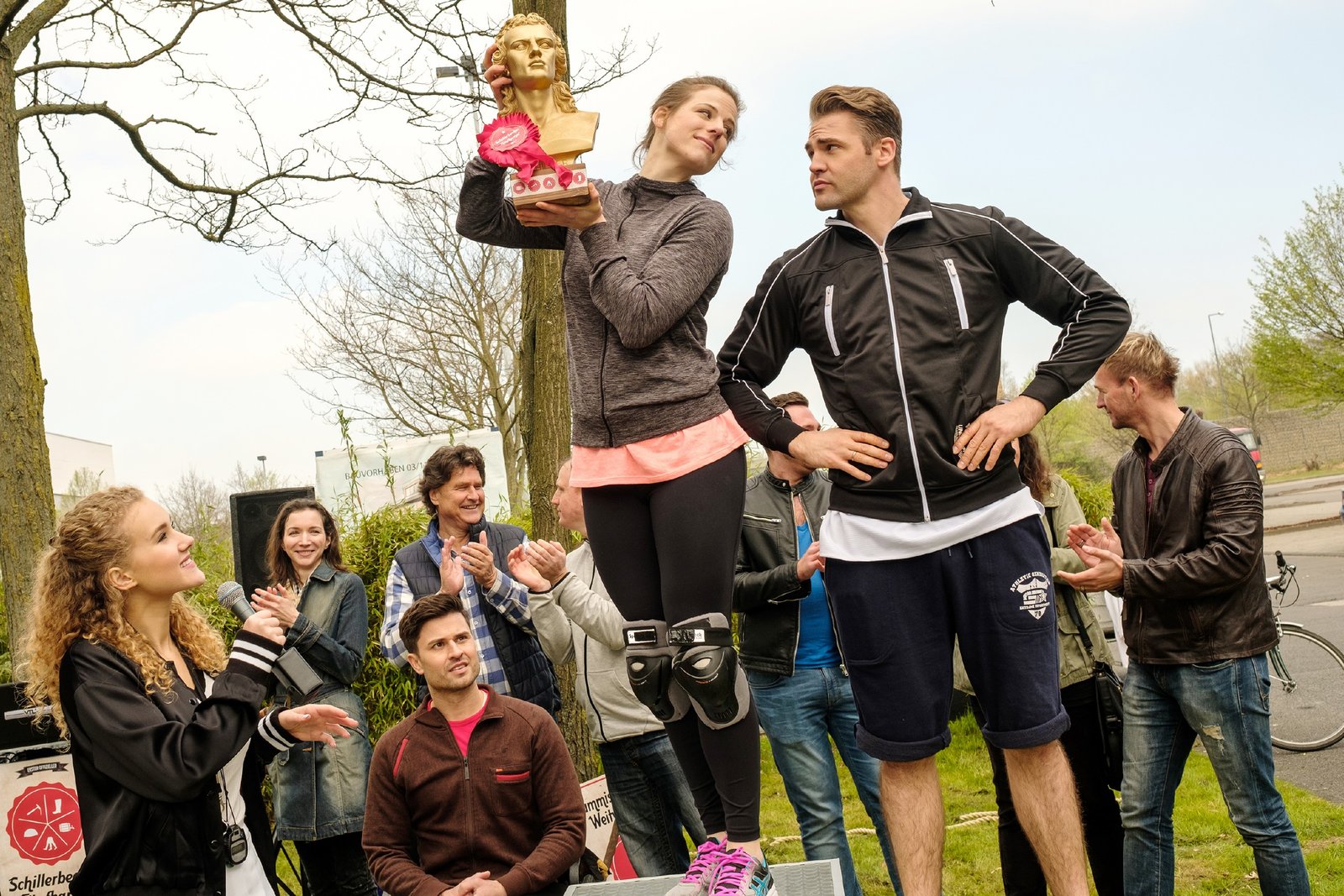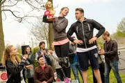 Der große TagWährend KayC (Pauline Angert, l.) der Gewinnerin gratuliert und Elli (Nora Koppen, M.) über Bambi (Benjamin Heinrich, vorne r.) triumphiert, verschweigt Paco (Milos Vukovic, 3.v.l.) Elli, bei ihrem Sieg nachgeholfen zu haben...Bild: © RTL / Stefan Behrens