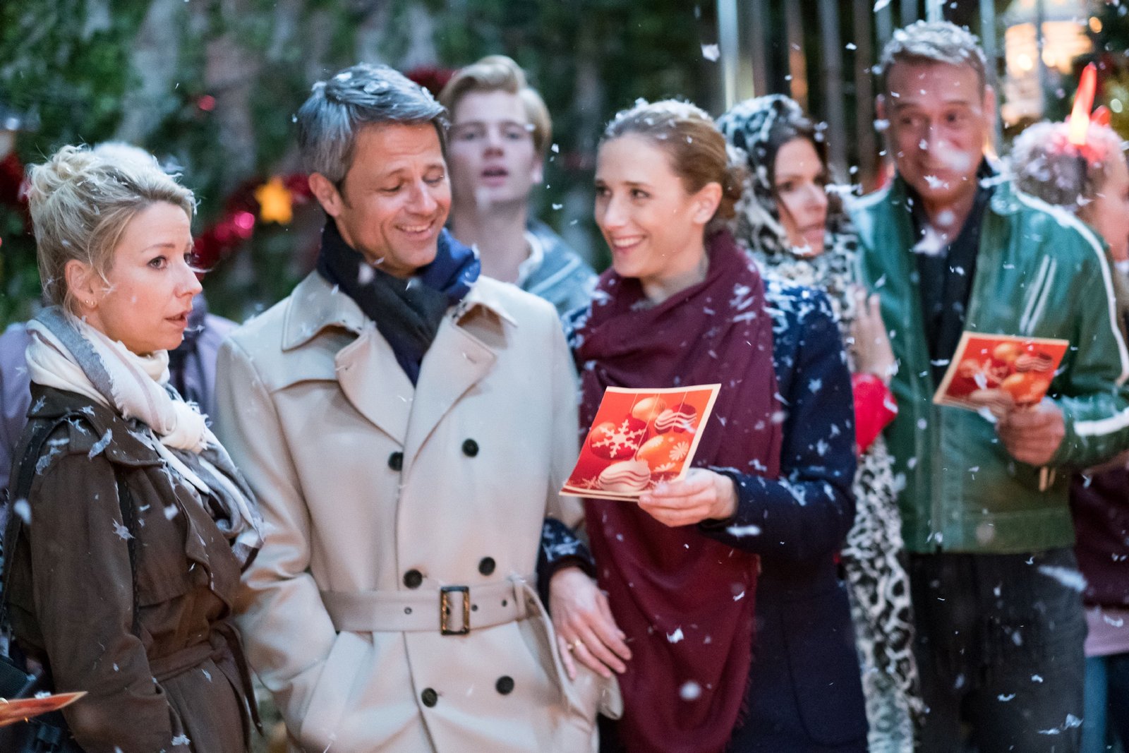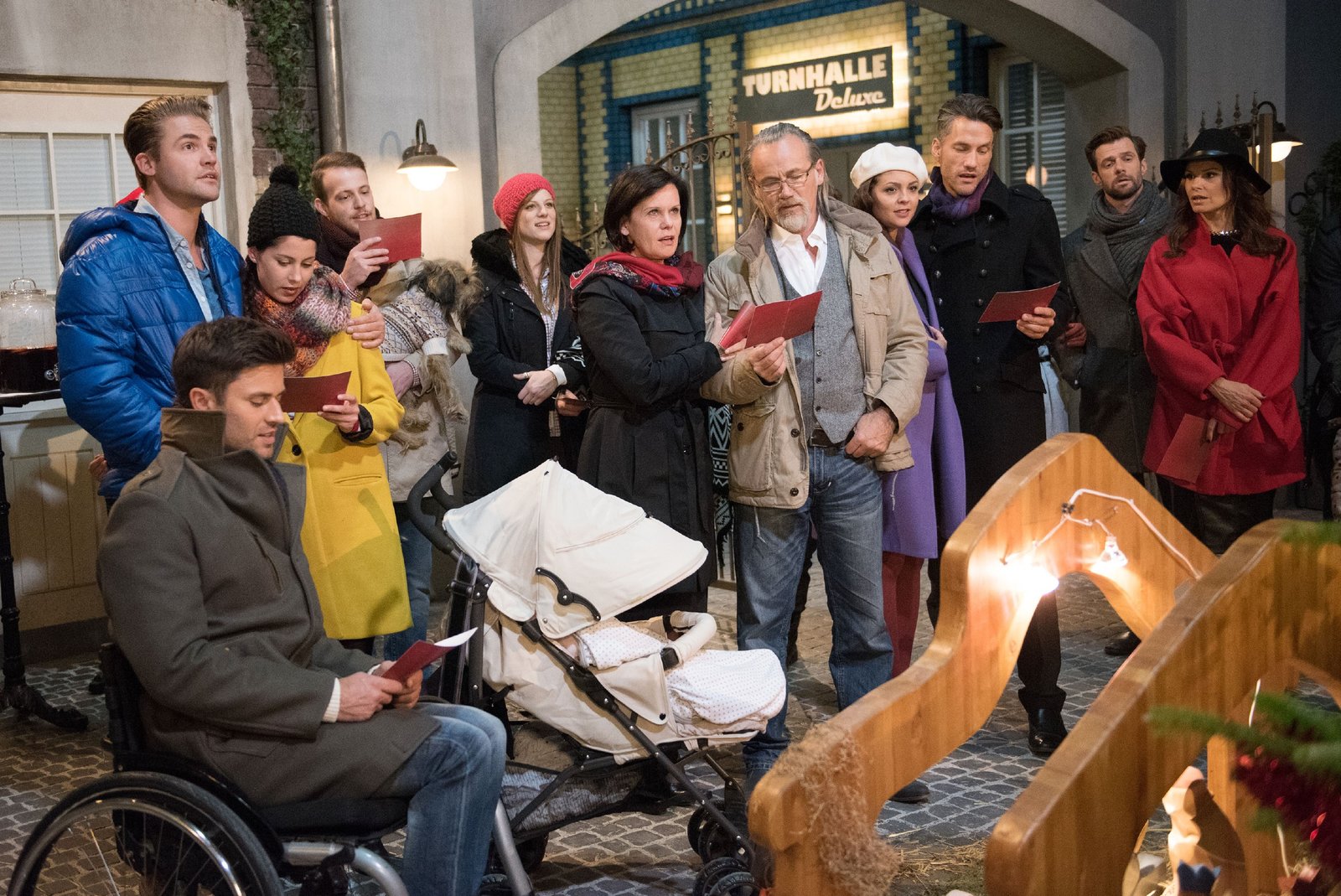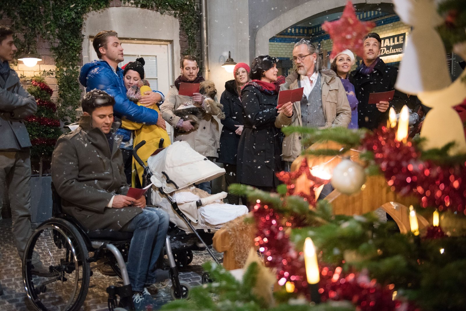 Besinnliches FestTraditionell haben sich die Bewohner der Schillerallee, (vorne v.l.) Paco (Milos Vukovic), Bambi (Benjamin Heinrich), Sina (Valea Katharina Scalabrino), Tobias (Patrick Müller), Elli (Nora Koppen), Irene (Petra Blossey), Robert (Luca Maric), Caro (Ines Kurenbach), Malte (Stefan Bockelmann), Henning (Benjamin Kiss) und Britta (Tabea Heynig), im Innenhof zum gemeinsamen Singen eingefunden.Bild: © RTL / Stefan Behrens